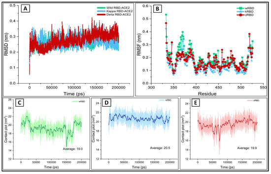 The molecular dynamics results of ACE2 in complex with the wild, kappa, and delta RBD during the 200 ns (A) The backbone RMSD of wtRBD (green), kRBD (blue), and dRBD (red) (B) The RMSF of wtRBD (green), kRBD (blue) and dRBD (red) in complex with the ACE2. The contact surface area of (C) wtRBD (green) (D) kRBD (blue), and (E) dRBD (red) structures of RBD bound to the ACE2.