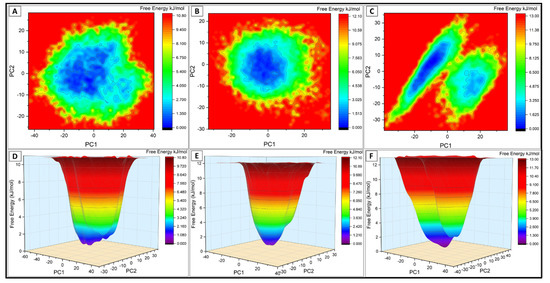 PCA or essential dynamics is one of the dimensionality reduction techniques used to extract the principal motion in conformational ensemble generated by protein dynamics in collective coordinate space [51]. This statistical technique is significant for reducing the data complexity [52]. The PC1 and PC2, along with the corresponding free energy, were plotted (Figure 3). As shown in Figure 3, most of the simulation ensembles in the variants are concentrated to a narrow range of conformational space, indicating better stability and compact packing of the variant complexes.