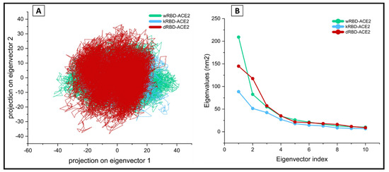 (A) The 2D eigenvector projection plot showing the differences in the dynamic fluctuations of the wtRBD (green), kRBD (blue), and dRBD (red) complexes of SARS-CoV-2 with the ACE2 (B) the plot for the eigenvalues for the top 10 selected vector.
