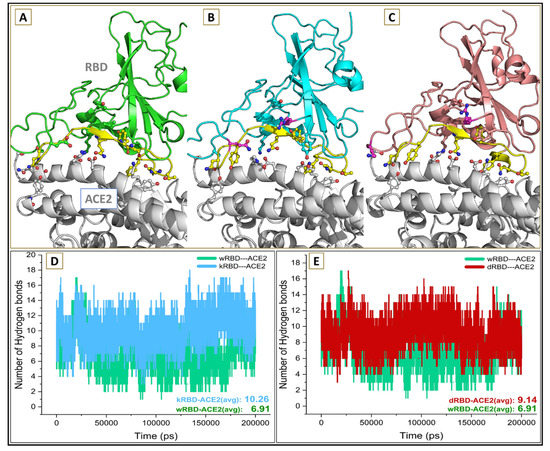 The interfacial binding region between (A) wtRBD–ACE2 in green, (B) kRBD–ACE2 in cyan and (C) dRBD–ACE2 complex in pink color. The average number of intermolecular hydrogen bonds between (D) wtRBD–ACE2 (green) and kRBD–ACE2 (cyan) and (E) wtRBD–ACE2 (green) and dRBD–ACE2 (red).