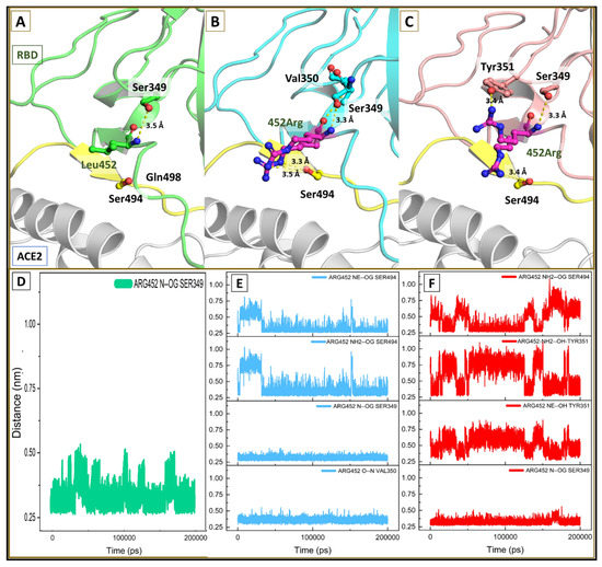 Binding conformation of mutant residue 452. (A) Leucine 452 making backbone hydrogen bond interaction with Ser349; (B,C) showing hydrogen-bonded interaction of 452Arg in kRBD and dRBD; (D–F) plot for hydrogen bond distance through the course of simulation in wtRBD, kRBD and dRBD.
