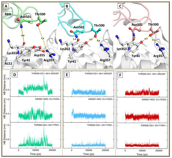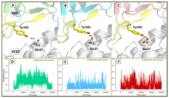 Intermolecular hydrogen bonds at the binding interface (A–C) showing hydrogen-bonded interactions at position 505 in the wild (green), kappa (cyan) and delta (red) respectively; (D–F) plot for hydrogen bond distance.