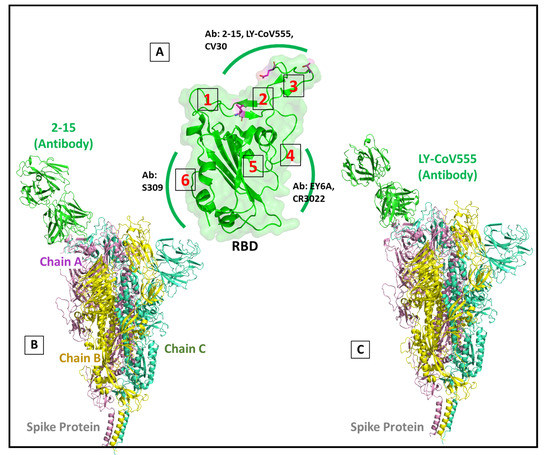 Diagrammatic representation depicting different antibody binding regions on the RBD. (A) ribbon and surface representation of RBD showing different antibodies targeting different regions. The mutant residues are colored in magenta (B,C) ribbon representation showing antibody 2-15 and LY-CoV555 orientated to RBD.