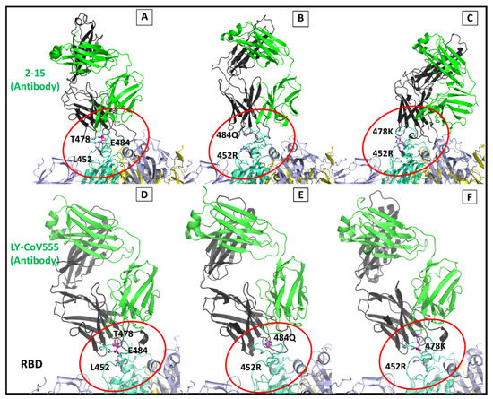 To account for the changes in the binding pattern in the variants, we build the complete complex system around 6 Å distance on the Abs, which included the other two subunits of the homotrimer S protein, as shown in Figure 11. The S protein consists of three chains (A, B, and C). The neutralizing Abs orient themselves at the RBD domain (Figure 11B,C), with mutant residues depicted inside the red circle (Figure 12A–F). SARS-CoV-2 neutralizing Ab 2-15 and LY-CoV555 (bamlanivimab) were selected for the mutational analysis. The complex system was exceedingly large, with 80,367, 80,325, and 80,349 atoms in wt, kappa, and delta mutant complexes, respectively. Our study found that the mutations in the delta and kappa variants of SARS-CoV-2 decrease the binding affinity of the selected Abs. We also observed the changes in the loop conformations at the interface in the dRBD–2-15 complex. The Ab binding region is shifted with the lighter chain of Ab, making hydrophobic interactions with the loop residues on the chain B subunit of the S protein.