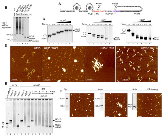 Quinary interactions and architectural behaviour of NC:NA NP complexes upon PR processing. (A) Sequence of NCp15 and PR cleavage sites (NC/SP2 in red, SP2/P6 in magenta). (B) Electrophoretic migration on agarose gel of M13 ssDNA:NCp7 NP complexes. Serial dilutions of both ssDNA (expressed in total [nt]) and NCp7, keeping a constant ratio RNC/nt = 1/10, were incubated for 30 min at 37 C before electrophoresis at 4 C and DNA staining. DNA smears; hallmarks of ssDNA/NCp7 aggregates (lanes 2–4) are converted into fast migrating ssDNA/NCp7 condensates (lanes 5–6) upon dilution. Position of circular ssDNA and traces of linear ssDNA are indicated. (C) Comparison of the electrophoretic mobility in 1% agarose of the circular M13 ssDNA in complex with NCp15, NCp9, and NCp7 upon increasing protein concentration. RNC/nt indicate the protein/nucleotide ratio. (D) AFM imaging of M13 ssDNA (0.4 nM) incubated from left to right without protein, with NCp15, NCp9, and NCp7 at RNC/nt = 1/10. (E,F) Sequential proteolysis of M13 ssDNA-bound NCp15 followed by EMSA, SDS-PAGE, and AFM. ssDNA (1 nM):NCp15 (750 nM) complexes were assembled at pH 6.25 and subsequently cleaved by PR (35 nM) at the indicated times at 37 C. Each reaction was stopped by chilling the tubes on ice, and the tube contents were used to follow ssDNA:NC complex migration by EMSA (E), the maturation state of NC proteins by SDS-PAGE (inserts in F), and ssDNA:NC complex morphology by AFM (F) at t = 30 s, 8 min and 16 min. In (E), NC:NA complex migration controls for NCp15, NCp9, and NCp7 are shown at pH 7.4 and pH 6.25 (optimal for PR cleavage).