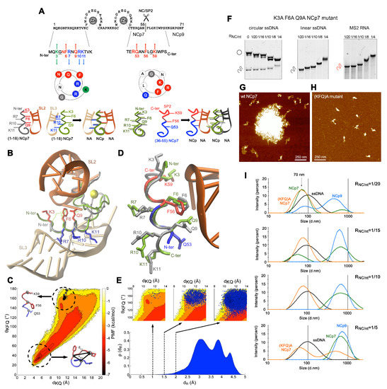 NC:NA quinary interactions. (A) The N-terminal 3-helix and the NC-SP2 cleavage site contain DNA strand bridging motifs. The Wenxiang diagram shows the residues of the N-terminal 3-helix in contact with SL3-RNA (red) or SL2-RNA (blue). The diagram of the 53–60 sequence shows the Q53-F56-G58-K59 motif mirroring the K3-G4-F6-Q9 motif in contact with SL2. The schematics indicate possible NA-NC-NA network assemblies provided by such NA binding domains. (B) Superposition of the N-terminal domain backbone of NCp7 in complex with SL3 (PDB ID: 1A1T) and SL2 (PDB ID: 1F6U). (C) Potential of mean force (PMF) plot in the 2D reaction coordinate space of the K59-Q53 Cα distance (dKQ) and K59-F56-Q53 Cα angle (θFQK) order parameters. The NC-SP2 apo-octapeptide exhibits substantial flexibility and is energetically dominated (PMF ∼ 5–7 kcal/mol) by a turn-like structure (dKQ ∼ 4–6 Å, θKFQ ∼ 20°–40°). The conformational ensemble also samples a region (dKQ ∼ 10–12 Å, θKFQ ∼ 140°–180°) with less frequency (PMF ∼1–3 kcal/mol) that is compatible with a 310 helical structure and where NMR conformers of NCp7 from 1F6U (grey circles) are located. For NMR conformers, dKQ corresponds to the K3-Q10 Cα distance and θFQK to the K3-F6-Q9 Cα angle. (D) Structure of best-fitting conformer of the R52–K59 segment superimposed head-to-tail with the N-terminal domain of NCp7. (E) Probability distribution of the conformer ensemble Cα root-mean-squared deviation (RMSD) of the K59-R52 residues aligned to the K3-R10 residues of a single structure of the N-terminal 310 helix in 1F6U. Three conformer sub-populations within an RMSD of 2 Å, 1.5 Å and 1 Å were extracted. Mapping the conformers onto the dKQ–θKFQ order parameters (blue circles) show they occupy the same conformational sub-space. (F) Electrophoretic migration in agarose of M13 ssDNA (circular and linear forms) or MS2 RNA in complex with increasing concentrations of a K3AF6AQ9A NCp7 mutant. (G,H) AFM imaging of wt-NCp7 and K3AF6AQ9A NCp7 mutant incubated with M13 ssDNA in the absence of magnesium. (I) DLS analysis of NCp7 (green), NCp9 (blue), and K3AF6AQ9A NCp7 mutant (orange) in complex with M13 ssDNA (black) for increasing NC:nt ratio in the absence of magnesium. Experiments with free and bound-ssDNA are reported on the same graph for clarity.