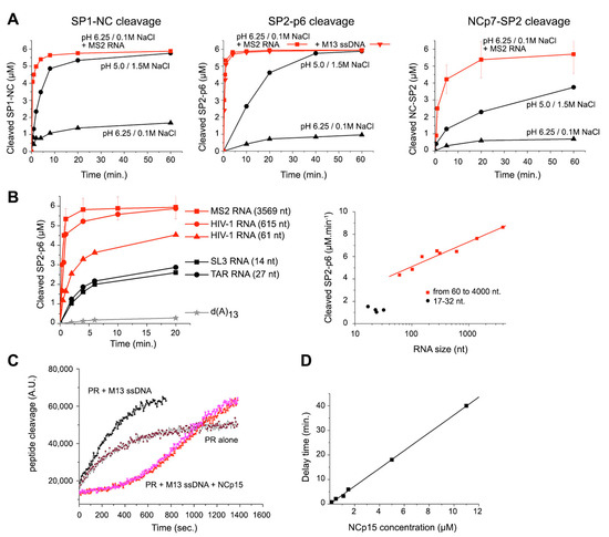 We focused on the NC-ssNA NP assemblies and their influence on NCp15 cleavage at pH 6.25 and 0.1 M NaCl. We first compared the influence of a large-scale assembly of NCp15 on M13 ssDNA or MS2 RNA versus stoichiometric complexes formed between NC and a TAR RNA stem-loop (Supplementary Figure S4a). The NA concentrations were varied for a fixed concentration of NCp15. A biphasic effect was observed in the presence of either long ssNA, PR reaching maximal activity when NCp15 saturated the ssNA lattices (Supplementary Figure S4b). A substantial reduction in PR efficacy was observed upon dispersion of NCp15 over the lattice, even though cleavage was maintained at a much higher level than in the absence of NA. In contrast, neither a biphasic effect nor a rapid rate was observed in the presence of the TAR-RNA.