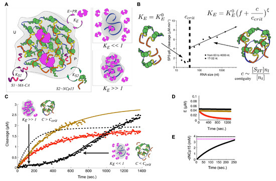 These data were interpreted by devising a theoretical model of RNP-modulated enzyme-substrate reaction kinetics (Supplementary Note, Figure S4), which partitions the reaction volume between distinct regions that are either occupied (pervaded, P) or unoccupied (unpervaded, U) by NA, and with fractional volumes and = − 1, respectively. Reacting species (substrates S1: MA-CA and S2: NCp15; enzyme E: PR) exhibit equilibrium absorption (with equilibrium constants K, K and K, respectively) between these regions due to non-sequence-specific NA-binding (Figure 4A).
