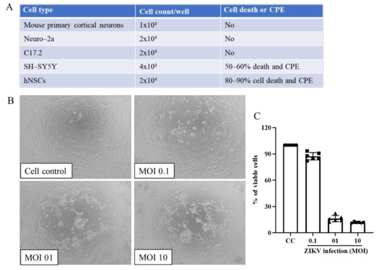 One of the important aspects is selecting cells or cell lines which were based on organ specificity of the virus infections and its ability to kill and replicate. There are several useful neuronal cell lines for testing the effect of drug inhibition of virus-induced cell death in neurons, including SH-SY5Y cells that have been well characterized [31], Neuro-2a, a mouse neuroblastoma cell line (ATCC CCL-131), and C17.2 cells, a retrovirus-transformed murine neural cell line [32]. Subsequent analysis of candidate compounds can then be completed on additional cell lines as well as human stem cells or mouse primary cortical neurons (described below) [33] to determine if the target drug consistently inhibits virus infection or virus-induced cell death, before testing in advanced model systems. Below is detailed information on several cell lines that can be used to study neurovirulent viruses. It is important to test these cell lines for ability to be infected with the virus being studied and to do a kinetic analysis of virus replication in the key cell lines.