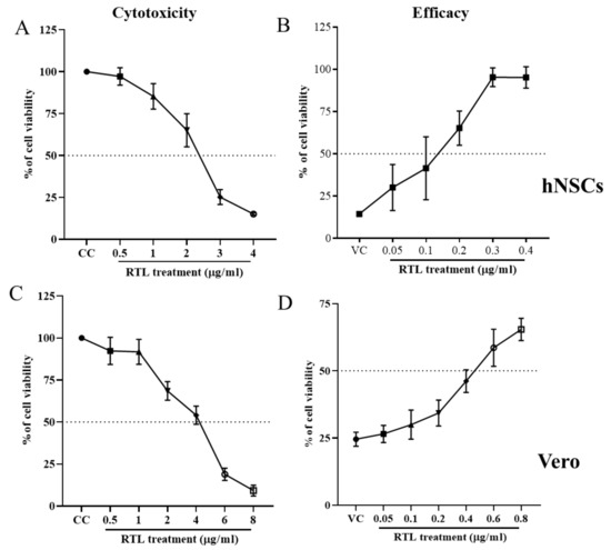 Since RTL inhibited ZIKV production and cell death, we performed a time of addition assay to understand the basic antiviral mechanism and the timeframe of RTL’s effect on ZIKV infection. hNSCs cells were treated with RTL (2xEC50) at pre-treatment, co-treatment, post-treatment or throughout-treatment and quantified the cell viability using MTT assay. RTL pre- and co-treatment did not protect against ZIKV (Figure 7). However, adding RLT at post and throughout time frames did significantly increase cell viability (Figure 7). This study suggests that the RTL inhibits ZIKV virus infection after entry to the cells, possibly by preventing virus replication or release. Further studies, including analysis of cellular localization of virus in RTL-treated cells, would be needed to directly determine the mode of action of inhibition. However, this study indicates that RTL prevents ZIKV-induced cell death by limiting virus replication in neuronal stem cells. Furthermore, this inhibition occurs post infection of the cell.