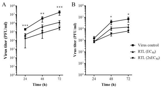 - Mix the drug (at 2–10-fold EC50 concentration) with virus (103 to 106 PFU/mL) and incubate for 1 h in 37 °C.