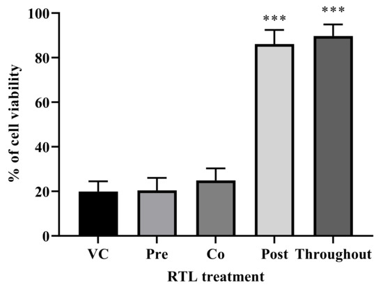 Effect of time of addition of RTL (2xEC50 dose) on ZIKV-induced death of hNSCs. Cells were treated with RTL (2xEC50 dose) at pre-, co-, post- and throughout-treatment time frame of ZIKV infection. Each bar represents differences between six individual wells of a two-independent experiment. *** p < 0.001 by one-way ANOVA using Dunnett’s multiple comparison test.
