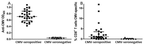 Study participants were tested for CD8+ T cell responses against CMV pp65 and immediate early-1 (IE-1) proteins using sets of overlapping peptides (Peptivator, Miltenyi Biotec, San Diego, CA, USA). Aliquots of 2 × 106 PBMC in 1 mL lymphocyte medium (RPMI 1640 with 10% FCS, 100 IU/mL penicillin, 100 µg/mL streptomycin, 2 mM l-glutamine, 10 mM HEPES buffer solution, and 2.0 × 10−5 M 2-mercaptoethanol from Invitrogen, Carlsbad, CA, USA) were stimulated with pooled CMV-pp65 (0.5 µg/mL) and IE-1 (0.5 µg/mL) peptide sets for 60 min at 37 °C (5% CO2). Brefeldin A (Sigma-Aldrich) was then added to a final concentration of 10.0 µg/mL and the PBMC left for an additional 4 h before staining for surface markers and intracellular interferon-gamma (IFN-γ). Cells were washed twice in flow cytometry buffer consisting of PBS with 0.2% NaN3, 5 mM ethylenediaminetetraacetic acid (EDTA, Sigma-Aldrich), and 0.5% FCS, then stained with fluorescein isothiocyanate-conjugated anti-human CD3, clone BW264/56, and peridinin chlorophyll protein-conjugated anti-human CD8, clone BW135/80, (Miltenyi Biotec), for 20 min at 4 °C. Samples were kept in the dark, and after another wash with flow buffer, cells were fixed and permeabilized with InsideStain (Miltenyi Biotec) according to manufacturer’s instructions, then stained with allophycocyanin-conjugated anti-human IFN-γ, clone 4S.83 (eBioscience).
