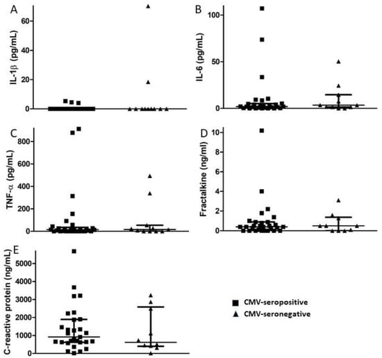 Comparison of plasma levels of inflammatory markers in CMV-seropositive and CMV-seronegative study participants. Plasma levels of the pro-inflammatory cytokines (A) IL-1β, (B) IL-6, (C) TNF-α, (D) the chemokine fractalkine, and (E) acute phase protein CRP were measured by ELISA at the time of study entry for each participant and median values compared between CMV-seropositive and CMV-seronegative groups. Error bars on graphs show median ± interquartile range for each group. No significant differences between CMV seropositive and –seronegative groups were observed. Mann–Whitney U-test, (A) p = 0.452, (B) p = 0.584, (C) p = 0.939, (D) p = 0.909, (E) p = 0.531.