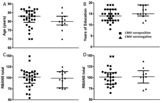 Comparison of age, years of education, and RBANS total scores between groups of CMV-seropositive and CMV-seronegative subjects. (A) Age and (B) years of education are represented as at study entry (t1) for all subjects. Following neuropsychological testing, RBANS total scores were calculated at t1 for all study subjects (C) and approximately 18 months later (t2) for all study subjects completing follow-up (D). Error bars on graphs show median ± interquartile range for each group. No significant differences between CMV-seropositive and -seronegative groups were observed. Mann–Whitney U-test, (A) p = 0.215, (B) p = 0.128, (C) p = 0.883, (D) p = 0.895.