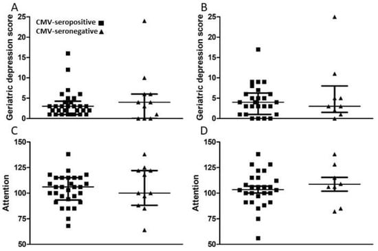 Comparison of geriatric depression and attention scores between groups of CMV-seropositive and -seronegative subjects at t1 and t2. (A,C) Following neuropsychological testing, geriatric depression and attention scores were calculated at t1 for all study subjects and (B,D) approximately 18 months later (t2) for all study subjects completing follow-up. Error bars on graphs show median ± interquartile range for each group. No significant differences between CMV-seropositive and -seronegative groups were observed. Mann–Whitney U-test, (A) p = 0.766, (B) p = 1.000, (C) p = 0.605, (D) p = 0.442.