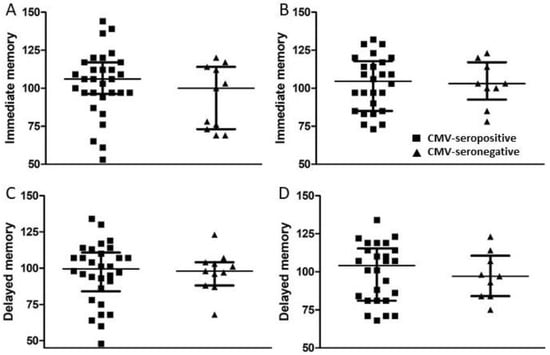 Comparison of immediate and delayed memory scores between groups of CMV-seropositive and -seronegative subjects at t1 and t2. (A,C) Following neuropsychological testing, immediate and delayed memory scores were calculated at t1 for all study subjects and (B,D) approximately 18 months later (t2) for all study subjects completing follow-up. Error bars on graphs show median ± interquartile range for each group. No significant differences between CMV-seropositive and -seronegative groups were observed. Mann–Whitney U-test, (A) p = 0.353, (B) p = 0.940, (C) p = 0.871, (D) p = 0.777.
