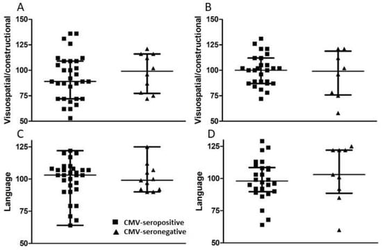 Comparison of visuospatial/constructional and language scores between groups of CMV-seropositive and -seronegative subjects at t1 and t2. (A,C) Following neuropsychological testing, visuospatial/constructional and language scores were calculated at t1 for all study subjects and (B,D) approximately 18 months later (t2) for all study subjects completing follow-up. Error bars on graphs show median ± interquartile range for each group. No significant differences between CMV-seropositive and -seronegative groups were observed. Mann–Whitney U-test, (A) p = 0.429, (B) p = 0.708, (C) p = 0.701, (D) p = 0.450.