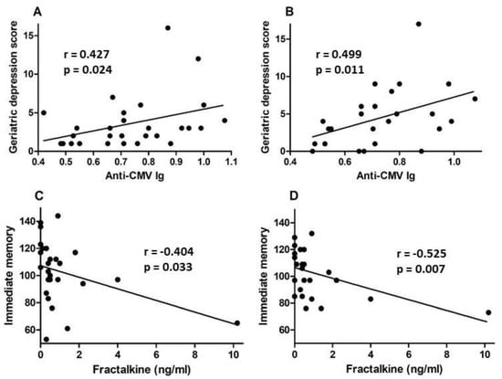 Correlation of anti-CMV IgG and fractalkine levels with neuropsychological test scores for CMV-seropositive subjects. Anti-CMV IgG levels in plasma were plotted against geriatric depression scores from neuropsychological testing at (A) study entry and (B) approximately 18 months later. Plasma fractalkine levels were plotted against immediate memory scores from neuropsychological testing at (C) study entry and (D) approximately 18 months later. Correlation was assessed by linear regression and correlation coefficient (r) and significance values (p) shown within each plot frame.