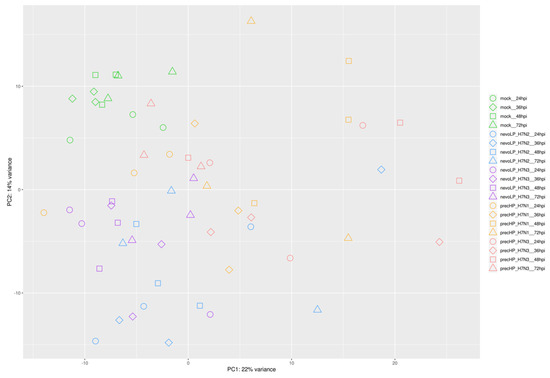 RNA was extracted from the tracheas of 6-week-old SPF chickens infected with 4 different H7 strains and the gene expression was quantified using RNA-Seq technology. A principal component analysis (PCA) was used to explore the general transcriptomic profiles of the analyzed samples, limiting the analysis on the first two dimensions; i.e., the ones explaining the greatest amount of variance belonging to the data. The PCA of the normalized counts for host genes confirmed separate groupings between the mock and H7-infected tracheas (Figure 1). Both the first and second principle components contributed to the separation of the mock group from the two categories of H7 strains, accounting for one-third of the total expression variation (22% for the first component, 14% for the second).