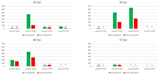 Differential expression analysis results for the four time-course H7 infections. At each timepoint, the total number of up- and downregulated genes is shown as a histogram.