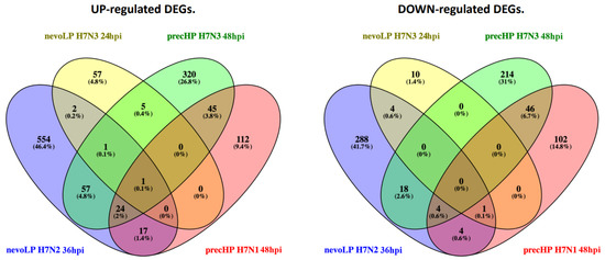 Focusing on the timepoints during which the host mounted the largest response, we checked how many DEGs were commonly shared among infections with different H7 strains (Figure 3). Overall, the majority of the DEGs were unique to each infection, with the nevoLP H7N2 challenge showing the highest percentage (44.3%) and the nevoLP H7N3 the lowest (3.6%). Comparing the two categories of virus, we see that the precHP strains have more common DEGs (6.6%) than the nevoLP strains (0.6%). It is worth pointing out that only one gene was commonly differentially expressed in all four infections, namely, interferon-induced protein with tetratricopeptide repeats 5 (IFIT5), a well-known anti-viral gene that is crucial for the innate immune response against viral infections in chickens [34,35].