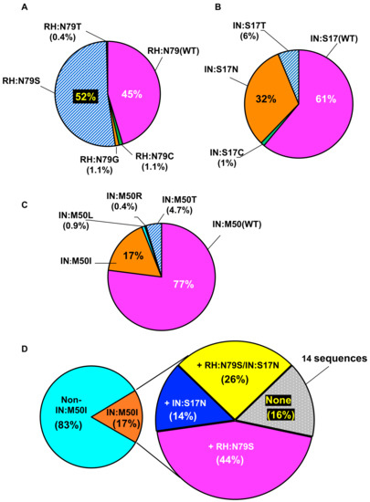 Our previous study using a series of recombinant HIV-1NL4.3 mutants demonstrated that virus containing IN:M50I mutation, mNL(IN:M50I), was a defective virus that suppressed the initial cleavage of GagPol polyproteins and viral release (note: the defective recombinant virus was depicted HIV(IN:M50I) in the previous work [16]; however, to avoid confusion, the mutant is redesignated as mNL(IN:M50I) in the current study); RH:N79S and IN:S17N mutations rescued the defect [16]. In order to define the emergence of those mutations during ART in NIAID clinical trials and the correlation between the defect and the compensatory mutations, a viral population analysis was conducted focusing on three mutations. We initially obtained a total of 556 HIV RNA sequence data from an NIAID HIV sequence data storage. Those sequences were derived from 213 patients enrolled in different clinical trials protocols with or without integrase inhibitors. HIV sequence reactions were conducted using plasma containing >1000 copies/mL of HIV RNA. After initial quality analysis, we excluded 27 sequences from four patients that contained integrase inhibitor (INI)-resistant mutations (Y143C/H/R; Q148H/K/R or N155H/S) [11,12]. A remaining total of 529 sequences from 209 patients (Table S1) were subjected to the population analysis focusing on RH:N79S, IN:S17N and IN:M50I that exist in majority of these sequences. First, we investigated the emergence of every single mutation in the amplicons. As shown in Figure 1A–C, RH:N79S, IN:S17N, and IN:M50I mutations were detected 52% (275 amplicons), 32% (169 amplicons), and 17% (90 amplicons), respectively.