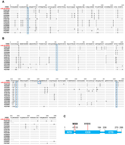 Amino acid Sequence Alignment of RH and IN. Amino acid sequences of RH (A) and IN (B) of 14 clones containing IN:M50I were aligned using the HIValign tool in LANL program (https://www.hiv.lanl.gov/content/sequence/VIRALIGN/viralign.html, accessed on 28 September 2021). HXB2 sequence was used as a reference sequence in the alignment. The mNL4.3 sequence was also included in the alignment as a control. (C) A schematic diagram presents mature HIV-1 IN. IN is composed of the N-terminal domain (NTD) (codons 1–49), the catalytic core domain (CCD) (codons 50–212) and the C-terminal domain (CTD) (codons 213–288) [30,31,32,33].