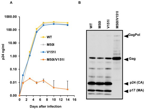 To confirm the combination effect of the mutations, we carried out WB analysis using 1 μg of total viral proteins of each virus with anti-p55(Gag)+p24(CA)+p17(MA) antibody to confirm that the single mutation had no impact on the GagPol processing. Mature cleaved p17 and p24 fragments were detected in HIV(WT), HIV(M50I), and HIV(IN:V151), but not in HIV(IN:M50I/V151I), and accumulation of uncleaved GagPol polyprotein was detected in the mutant (Figure 3B) as we showed in previous work [16]. Thus, the combination of mutations resulted in a defective HIV, and since all 14 clinical isolates lacked IN:V151I mutation and were identified in plasma containing 1207-201,353 copies/mL (Table 1), this indicated that the virus is released from cells. However, they might be defective in reinfection by uncharacterized mechanism(s), such as immature or lack of other viral proteins. We need to study further to conclude the M50I effect on replication capability in clinical isolates.