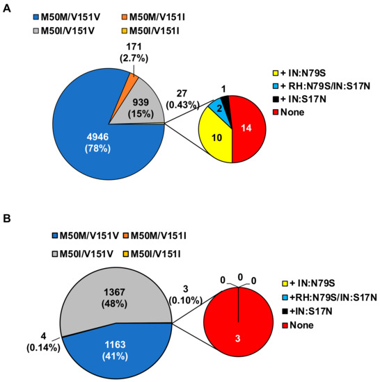 As described above, the virus replication assay indicated that an HIV containing the combination of M50I/V151I without RH:N79S or IN:S17N was a replication incompetent virus. Thus, we further analyzed the viruses containing the combination focusing on the presence of the compensatory mutation. In subtype B, nearly half of the sequences contained either RH:N79S or IN:S17N mutation, and surprisingly, 14 out of the 27 sequences did not contain the compensatory mutations (Figure 4A), and in subtype C, none of the three sequences possessed RH:N79S or IN:S17N mutations (Figure 4B).