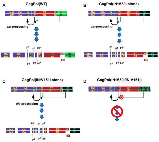 A schematic diagram illustrating IN:M50I/V151I effect. (A–C) GagPol polyproteins homodimerized, and the embedded PR in GagPol(WT) (A), GagPol(IN:M50I) (B), or GagPol(IN:V151I) (C) cleaves the polyproteins at the cleavage site between P2 and NC as the initial processing [5] and then sequential processing occurs. It is reported that IN positively regulates the initiation of autoprocessing [44,45,46] and the cleavage site between PR and RT is involved in the regulation (as shown in green arrows) [16]. (D) GagPol(IN:M50/IN:V151I) mutations also form homodimers [16]; however, the autoprocessing step is inhibited by an uncharacterized mechanism(s). Green arrows: the cleavage site between PR and RT regulates autoprocessing [16]. The region negatively regulates the autoprocessing in the presence of IN:M50I/V151I mutation via an uncharacterized mechanism. MA: matrix proteins (p17), CA: capsid protein (p24), N: nucleocapsid protein, P: protease, RT: reverse transcriptase, H: RNase H, IN: integrase, 50: M50I change in IN, 151: V151I change in IN.