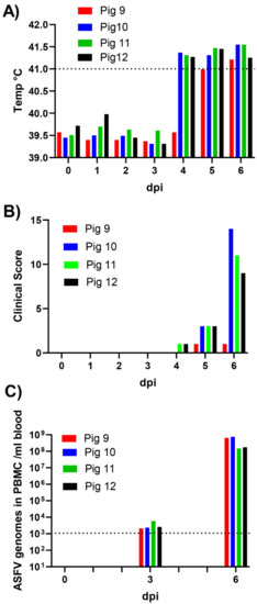 Upon arrival at the research facility, the four pigs were housed together in a high containment stable unit (BSL-3). After an acclimatization period of one week, the pigs were inoculated intranasally with 2 mL virus suspension containing 4 log10 TCID50 of the ASFV POL/2015/Podlaskie (see [16]). The time course of the infection in the pigs was followed from their clinical signs, rectal temperatures and using laboratory analyses as described in the following sections.