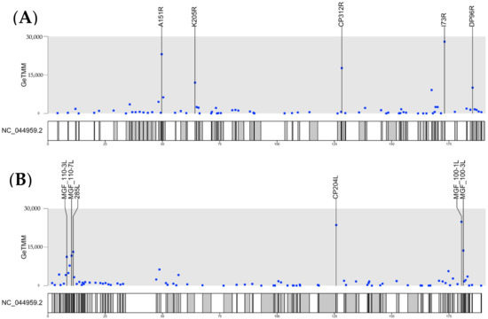 Analysis of ASFV gene transcription within PBMCs of ASFV-infected pigs at 6 dpi. The number of ASFV mRNA derived reads from PBMCs of infected pigs collected at 6 dpi were standardized according to the size of the library and the length of the ORFs (for ORFs >180 nt) and plotted (as GeTMM values) along the entire ASFV genome for the two separate strands of the ASFV genome (panel (A), genes transcribed from left to right and panel (B), genes transcribed from right to left). The ASFV genes with the highest GeTMM values are indicated.
