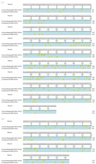 Alignment of M1 and M2 genes between A/Swine/Shandong/R3/2005 (H3N2) and A/California/04/2009 (H1N1) strains. Alignment was performed using MegAlign in Lasergene version 7.1.0 (DNASTAR, Madison, WI). The majority sequence is shown in the top row, the same nucleotides are hidden, and the different nucleotides are highlighted.