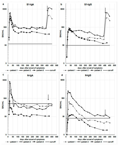 Concentrations of antibodies against SARS-CoV-2 S-protein (a): S1-IgA-(cut-off: 60 BAU/mL); (b): S1-IgG- (cut-off: 50 BAU/mL) and antibodies against SARS-CoV-2 N-protein (c): N-IgA-(cut-off: 250 BAU/mL); (d): N-IgG- (cut-off: 40 BAU/mL) expressed in terms of WHO BAU/mL in individual patients related to time [patient 1: day 13–452, patient 2: day 10–449, patient 3: day 11–423]) after the clinical beginning of COVID-19 disease. The vertical arrows in all figures mark the day of vaccination of patients 1 and 2, (BNT162b2 vaccine from Pfizer/BioNTech). The horizontal lines mark the respective cut-off levels.