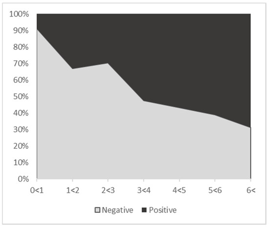 BoHV-6-positive animals ranged in age from 1 day to 13.62 years, with an average age of 3.86 years (Table 2). They were significantly older than negative animals (Mann–Whitney test, p < 0.001), which had an average age of 1.47 years (Table 2). For further analysis, animals were allocated by age to seven categories, each spanning one year. Figure 1 summarizes the age distribution for all tested animals and shows that the proportion of positive animals was increasing with age.