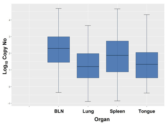Viral copy numbers varied substantially in the different organs and animals, ranging from as few as 0.13–0.45 copies/100 ng DNA to as many as 47,609 copies/100 ng DNA in a BLN (Figure 2). The variation was highest in BLN and spleen, whereas it was comparatively limited in the lung and tongue (Table 5).