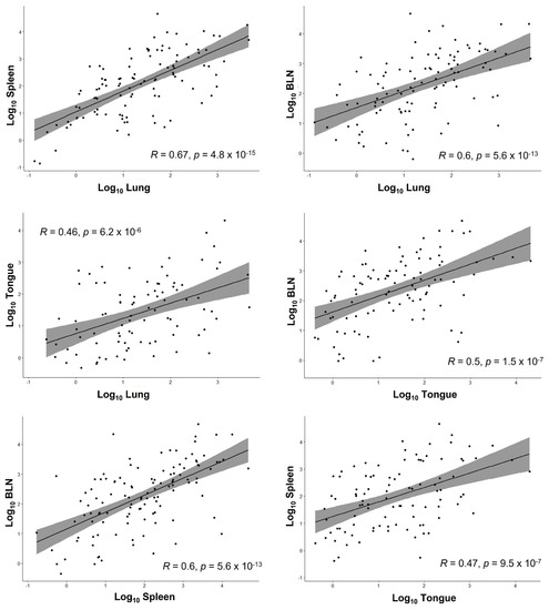 Transformation to decimal logarithm served to normalize the data and find associations between the viral load found in the different organs using the Shapiro–Wilk normality test. This did not reveal a significant correlation for viral copy numbers between the different organs (R2 below 0.75). The highest R2 was found between lung and spleen (R2 = 0.67), indicating a high probability to find both organs infected once one was found to be positive. The results are shown in Table 5 and in Figure 3.
