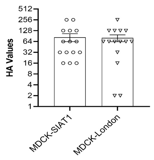 Hemagglutination assay was used to determine the presence or absence of hemagglutinating virus in all cell lysate supernatants for head-to-head comparison of HA titers, we used IAV-S isolates acquired from nasal samples in MDCK-SIAT1 and MDCK London cells only. The HA titers of IAV-S isolates obtained from nasal swabs that were propagated in the same way on MDCK-SIAT-1 and MDCK-London cell lines showed significantly higher HA titers compared to the remaining cell lines. Our results demonstrated that the HA titers were comparatively similar in both cell lines (Figure 1, p < 0.6), although some IAV-S isolates collected from MDCK-SIAT1 cells had higher HA titers.