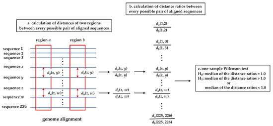 So, we can sample the rate ratios by taking the distance ratios by changing the combination of sequence pairs (see Figure 2b). As described above, the evolutionary rate of a region is determined by the constraint on the region. So, if there is no difference in constraint between two regions, a and b, the evolutionary rates, and , would be close to each other. Then, the median of the distance ratios calculated between various pairs of aligned sequences would take a value close to one.