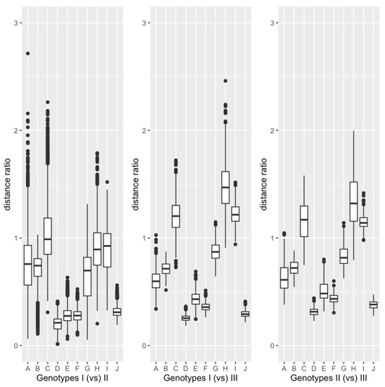 The order relation was also supported by the paired-sample Wilcoxon test for every possible pair of the three distance ratios (data not shown). In addition, the result of the one-sample Wilcoxon tests of edbp(x, y)/ and ednbp(x, y)/ and the medians were consistent with the relation. In contrast, the order relation of distance ratios obtained from the comparison between Genotypes I and II was different from those described above.