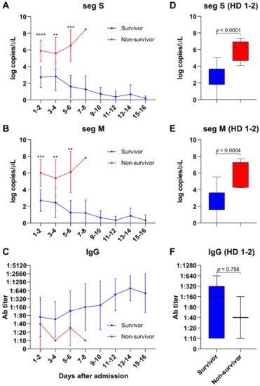 Plasma SFTS viral load and antibody titer in patients with SFTS. Both segment S (seg S) and M (seg M) titers were significantly higher in non-survivors than in survivors and increased during hospitalization (A,B). The SFTS viral load (hospital days 1–2) was significantly higher in non-survivors (D,E). The plasma antibody titer against SFTSV increased in survivors during hospitalization but decreased in non-survivors (C). There were no differences between the initial (hospital days 1–2) anti-SFTSV-IgG titers of the survivors and non-survivors (F). Blue, survivor; red, non-survivor. ** p < 0.01, *** p < 0.001, **** p < 0.0001.