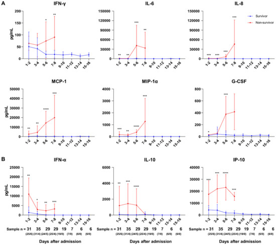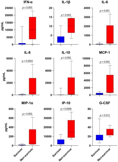 Initial plasma concentrations of cytokines and chemokines in patients with SFTS. The plasma concentrations of IFN-α, IL-1β, IL-6, IL-8, IL-10, MCP-1, MIP-1α, IP-10, and G-CSF on hospital days 1–2 in non-survivors were significantly higher than those in the survivors. Blue, survivor; red, non-survivor.
