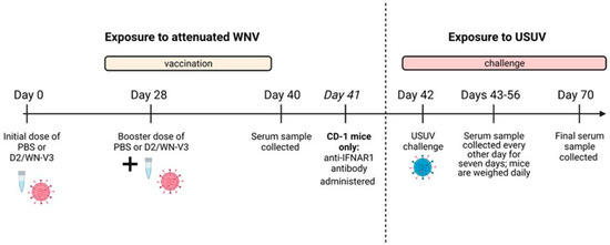 The interferon alpha and beta receptor 1 deficient mice (Ifnar1−/−) originally purchased from Jackson Laboratories (B6.129S2-Ifnar1tm1Agt/Mmjax) were bred in-house. A total of 32, 10 to18-weeks-old male and female mice were inoculated with 104 PFU of D2/WN chimera (n = 16) or sterile PBS (n = 16) via intraperitoneal (i.p.) injection (Figure 1). Twenty-eight days post vaccination (DPV), mice received a second dose of D2/WN chimera at 104 PFU, or PBS. A blood sample was collected via submandibular vein bleed 40 DPV. Forty-two days after the first vaccination, mice were challenged with 103 PFU of USUV Spain 2009 isolate (n = 16) or USUV Uganda 2012 isolate (n = 16) via rear footpad injection, a method that was used previously for USUV [31,32]. Mice were bled via submandibular bleed on days 1, 3, 5, and 7 post-USUV challenge. Weights were taken daily, and mice were observed for clinical signs of illness (weight loss, lethargy, tremors). Mice were euthanized when exhibiting clinical signs of disease such as ≥15% weight loss, or at 28 days post-USUV challenge. Serum samples were titrated by Vero cell plaque assay.