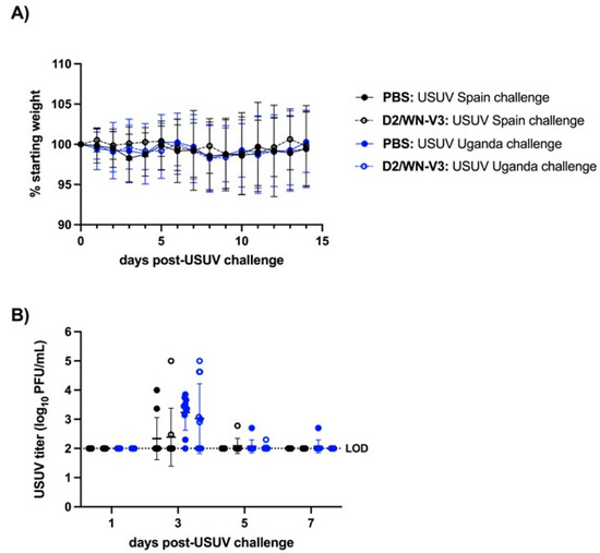 Morbidity and viremia profile of CD-1 mice post-USUV challenge. CD-1 mice were injected with D2/WN-V3 (n =20) or PBS (n = 20) and later challenged with a Spain (n = 19) or Uganda (n = 21) isolate of USUV. (A) Average percentage of initial weight post-challenge. (B) Viral titer of USUV in serum collected on day post-challenge (dpc) 1, 3, 5, and 7. Titers are reported as log10PFU per mL of serum. Lines represent mean; error bars represent standard deviation; and dashed line represents limit of detection (LOD). All negative titers were graphed at LOD and included in mean and standard deviation calculations.