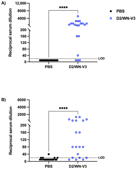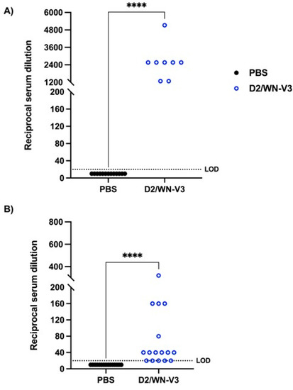 A recombinant live-attenuated vaccine (LAV) virus, D2/WN-V3 (also referred as D2/WN for abbreviation) that protects against lethal challenge of WNV in mice was previously developed, consisting of the premembrane (prM) and envelope (E) structural genes of WNV in an attenuated dengue virus (D2) backbone [26]. The D2/WN LAV retained all the original attenuation markers of the D2 backbone [27,28,29] and protected against lethal WNV challenge in vivo, including diminished neurovirulence in newborn mice and development of neutralizing antibodies against WNV in adult mice after primary immunization [26]. D2/WN was also evaluated for safety in mice, with no disease observed in newborn mice or AG129 mice [26,30].