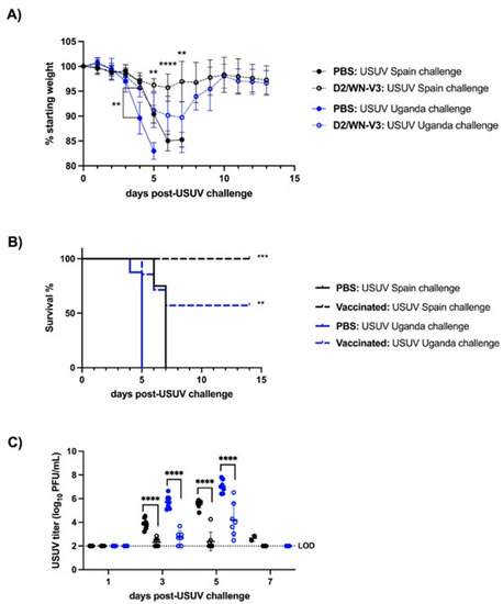 Changes in weight and serum titers were analyzed using a two-way ANOVA with Tukey’s multiple comparisons test. Survival curves between vaccinated and unvaccinated mice of the same USUV challenge group were analyzed using the Mantel–Cox test. Descriptive statistics were run to determine the geometric mean titers (GMTs) of vaccinated and unvaccinated groups for the PRNT50 results and compared via a nonparametric Mann–Whitney test. All analyses were done using GraphPad Prism 8.