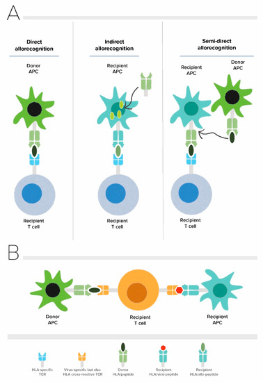 Allorecognition pathways and principle of heterologous immunity in alloreactive T cells. (A) Direct, indirect and semi-direct pathways of allorecognition (B) Allo-HLA cross-reactivity of virus-specific T cells. APC: Antigen presenting cell, TCR: T cell receptor.