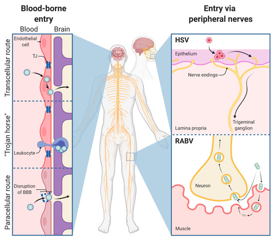 In contrast to other tissues, the micromilieu of the central nervous system (CNS) tightly controls brain immunity by different and unique immunomodulatory properties: the presence of tightly controlled physical barriers, the lack of a classical lymphatic drainage system, the presence of functional lymphatic vessels [1], the relative deficiency of constitutive MHC expression, and the immunomodulatory properties regulated via the expression of immunosuppressive proteins [2]. In the context of infection, access of pathogens to the CNS is limited by the blood–brain barrier (BBB), comprising a tightly connected endothelium and the glia limitans lining the CNS parenchyma [3]. If a pathogen gains access to the CNS, resident and innate immune cells mount innate immune responses, which lead to the recruitment of adaptive immune cells from the periphery. Under physiological conditions, immune responses in the CNS are limited to protect vulnerable and nonrenewable cells, such as neurons. Blood-borne viral pathogens, however, have evolved three different mechanisms to cross the neuroprotective BBB (1): (i) transcellular entry (West Nile virus, Zika virus, Japanese encephalitis virus), (ii) paracellular entry (Marburg virus, dengue virus, Ebola virus), and (iii) the so-called ‘Trojan horse entry’ in which the virus enters the CNS via circulating immune cells (HIV, Japanese encephalitis virus, measles virus, canine distemper virus) [4]. In contrast to paracellular transport, transcellular transport usually does not depend on the disruption of junction proteins, the actin cytoskeleton, or the basal lamina [4]. It is further subdivided into (i) free and passive diffusion limited to lipophilic substances, (ii) carrier-mediated transport, and (iii) vesicle-mediated transport [5]. In contrast, direct entry mechanisms (RABV, HSV, poliovirus, henipavirus) aim to bypass the neuroprotective barriers and enter the CNS via infection of nerve endings and long-distance transport of viral particles within the neuronal network (Figure 1) [2]. The exact mechanism of how viral pathogens such as RABV and HSV, both causing lethal encephalitis in humans, efficiently infect the CNS and how host immune responses contribute to or counteract efficient neuroinvasion remains a question of significant interest.
