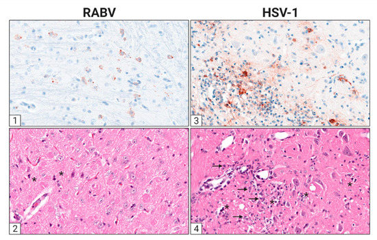 Comparative histopathology of RABV and HSV-1 infection in the murine brain. (1) Multiple brain stem neurons show positive signals against RABV antigen. The microscopic picture presents an immunohistochemistry staining using the ABC method. (2) Only a small number of necrotic neurons (asterisk) are present in the consecutive section of the RABV-infected brainstem. Inflammatory cells are absent. The microscopic picture presents hematoxylin and eosin staining. (3) Multiple neurons and glial cells of a murine brainstem are positive for HSV-1 antigen. The microscopic picture presents immunohistochemistry staining using the ABC method. (4) In contrast to RABV, as demonstrated in the consecutive section, HSV-1 infection induces a marked inflammatory response mainly consisting of infiltrating histiocytes and lymphocytes (arrow). Infected cells are necrotic (asterisk). The microscopic picture presents hematoxylin and eosin staining.